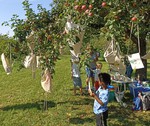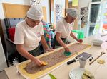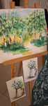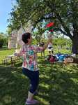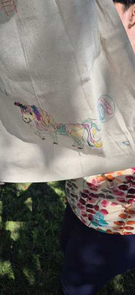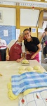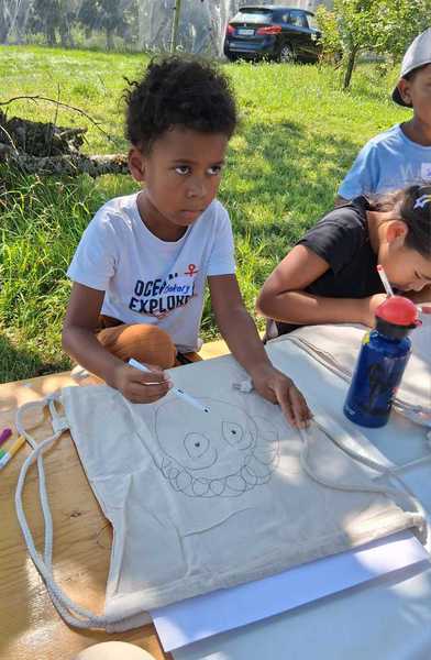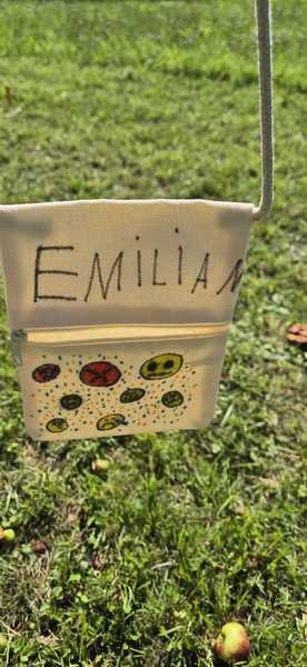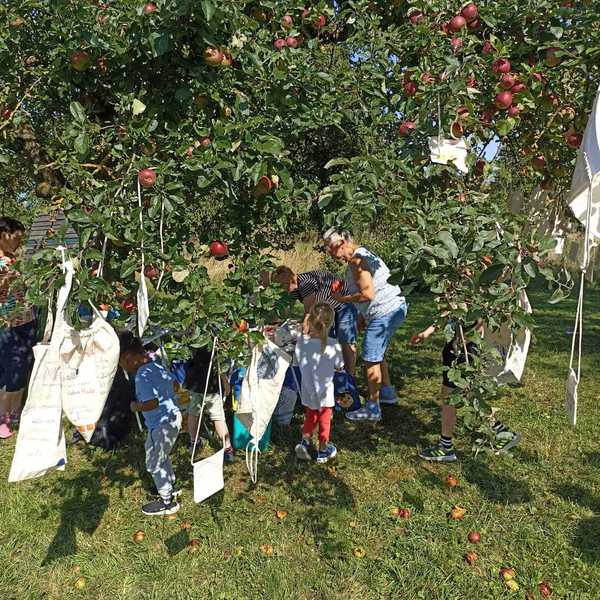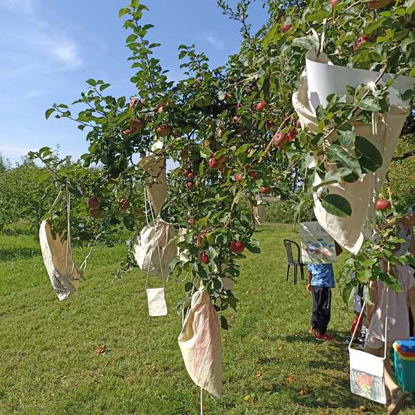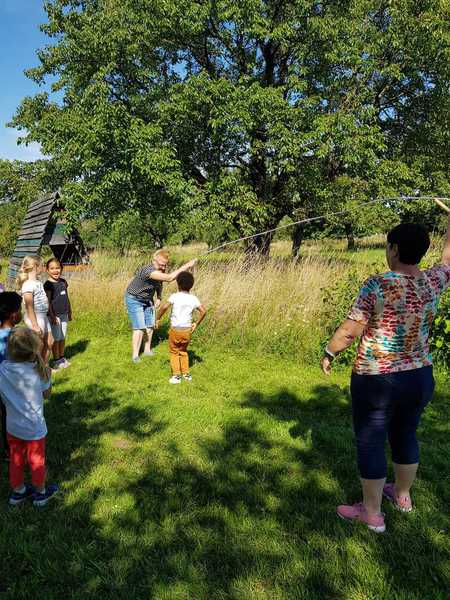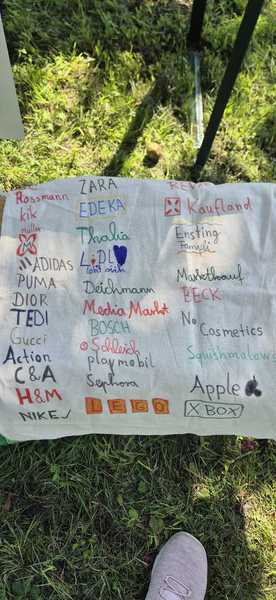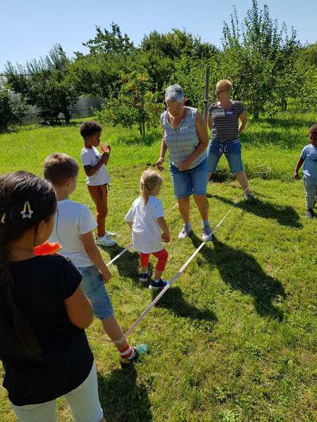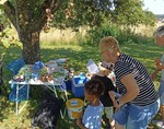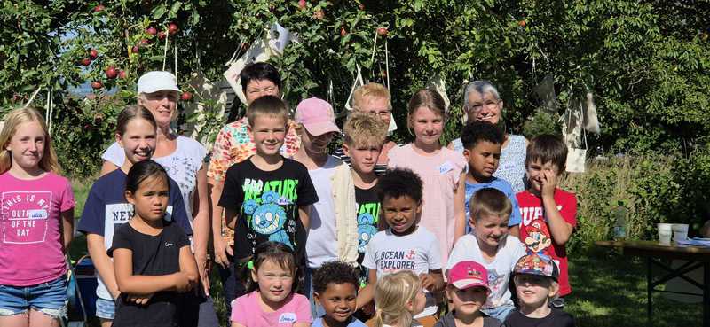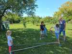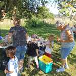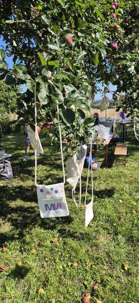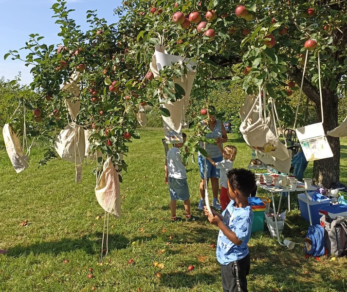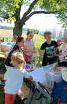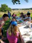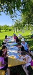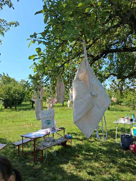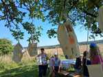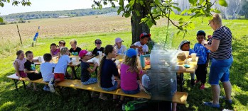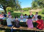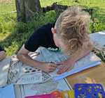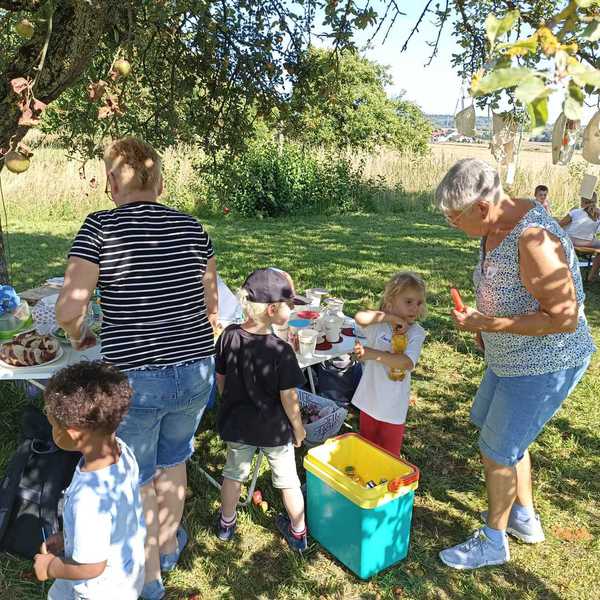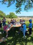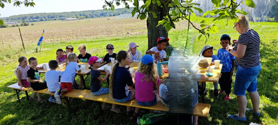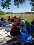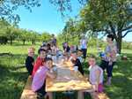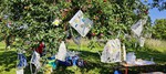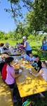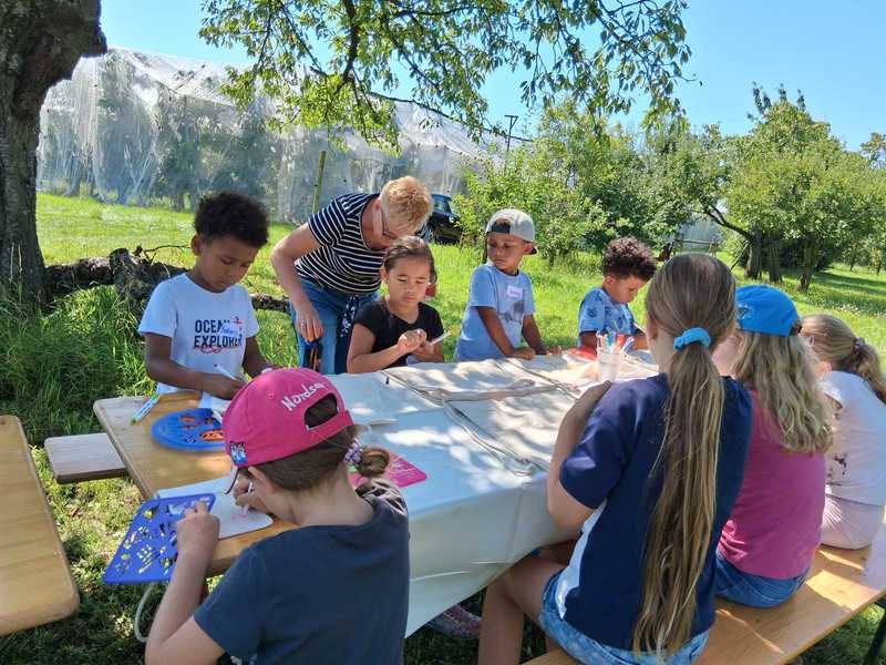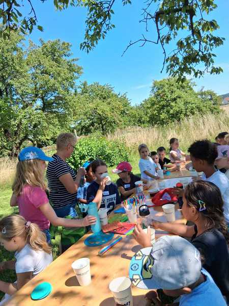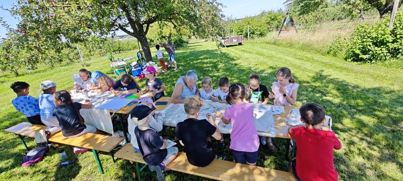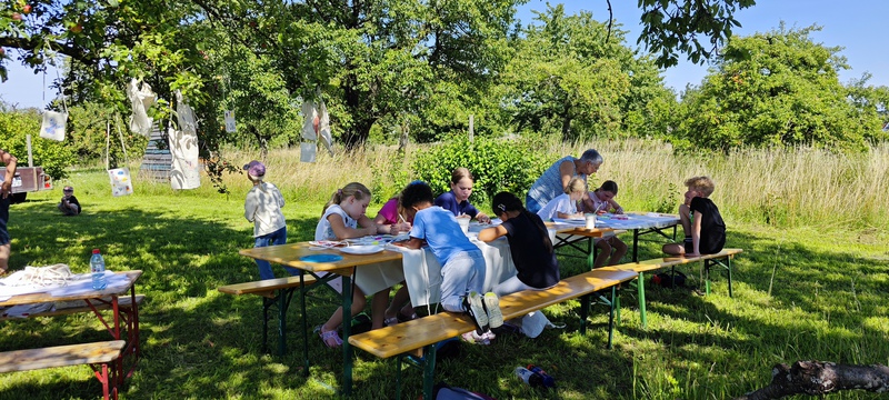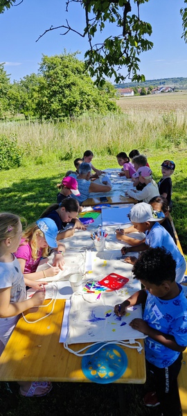 Bei schönstem Wetter trafen sich die Kinder und gemeinsam ging es auf eine große Wiese am Ortsrand von Erligheim. Dort war unter schattigen Bäumen die "Malwerkstatt" von unseren fleißigen Helferinnen aufgebaut.